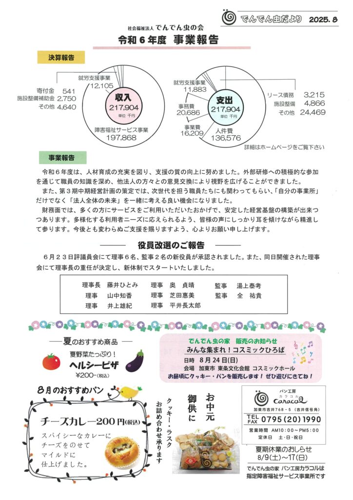 Home › blog › 「でんでん虫だより8月号」を発行いたしました! 2025-08-01 「でんでん虫だより8月号」を発行いたしました! 暑中お見舞い申し上げます 例年にないほど厳しい暑さが続いておりますが、いかがお過ごしでしょうか 酷暑の折柄、くれぐれもご自愛のほどお祈り申し上げます でんでん虫だより8月号 関連記事 『カラコルnews』1月おすすめパン 職員募集のお知らせ 「でんでん虫だより1月号」発行いたしました! 【パン工房カラコル】年末のご挨拶と年始営業日のお知らせ 高次脳機能障害の理解を深める講演会のご案内 『カラコルnews』7月のおすすめパン 『カラコルnews』8月おすすめパン