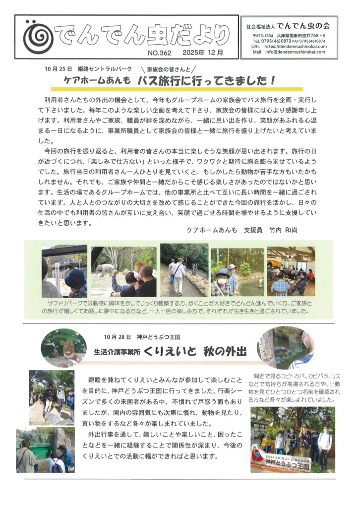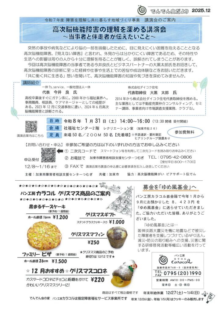 Home › blog › 「でんでん虫だより12月号」発行いたしました! 2025-12-02 「でんでん虫だより12月号」発行いたしました! でんでん虫だより12月号を発行いたしました! でんでん虫だより12月号 関連記事 「でんでん虫だより2月号」発行いたしました! ~共に学び、交流を深める~でんでん虫の会 全体研修会報告 『カラコルnews』1月おすすめパン 職員募集のお知らせ 「でんでん虫だより1月号」発行いたしました! 『カラコルnews』11月おすすめパン 『カラコルnews』12月おすすめパン